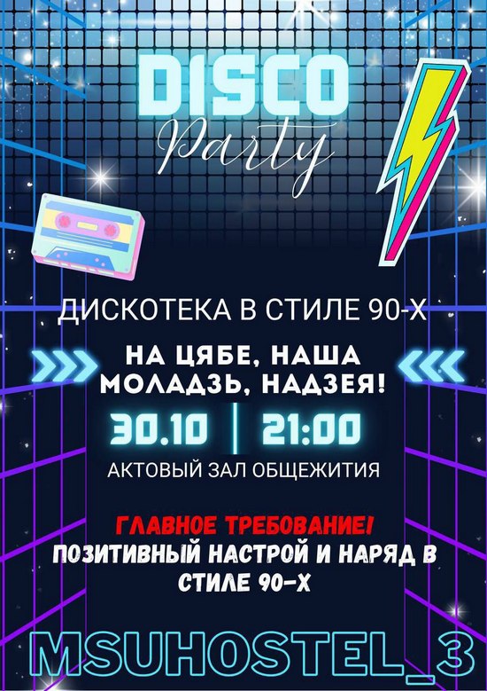 30 октября 2025 года в общежитии № 3 прошла зажигательная дискотека в стиле 90-х! Студенты факультета физического воспитания вместе с ребятами из других факультетов окунулись в атмосферу ностальгии: звучали легендарные хиты, на танцполе царило веселье и драйв. Музыка, яркие образы и искренние эмоции сделали вечер по-настоящему незабываемым!