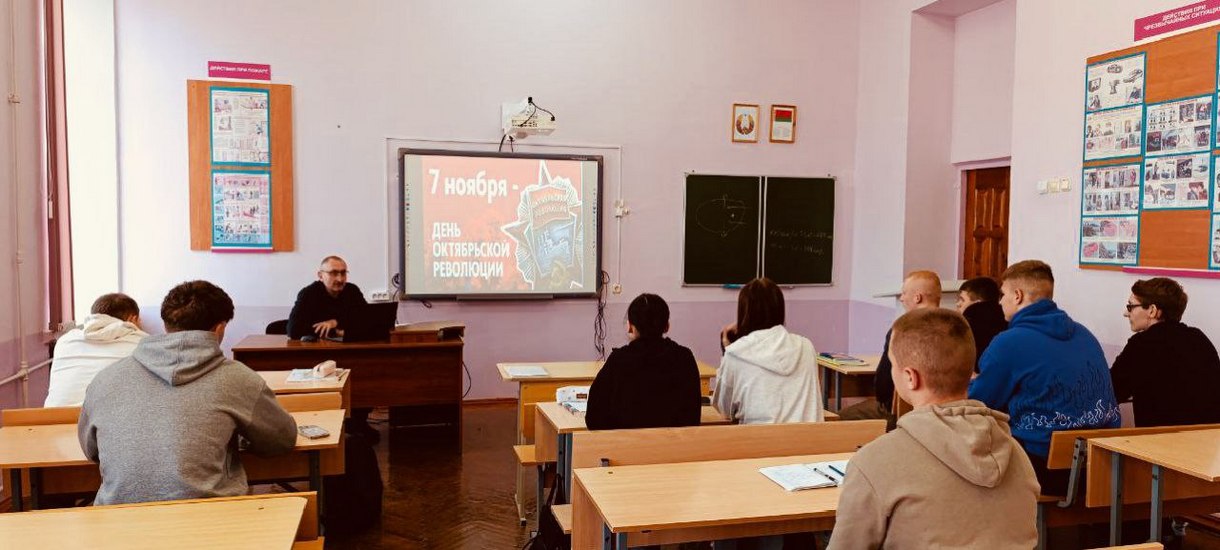 6 ноября в группе 6160251 прошел информационный час «7 ноября — День Октябрьской революции». Куратор Каранкевич А. И. провел небольшой исторический экскурс для студентов. Обозначил важность и значимость этого государственного праздника как напоминания о важности единства, трудолюбия и преемственности поколений.