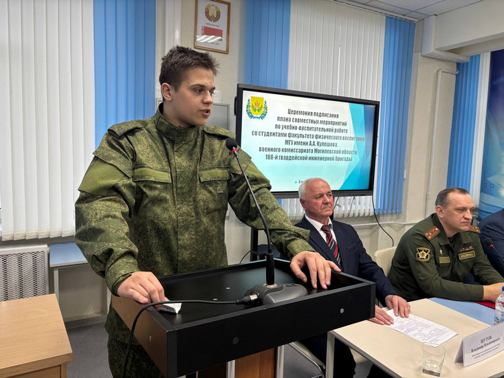 В МГУ имени А. А. Кулешова состоялась церемония подписания плана совместных мероприятий по учебно-воспитательной работе. В этом событии приняли участие представители факультета физического воспитания, военного комиссариата Могилевской области и 188-й гвардейской инженерной бригады.