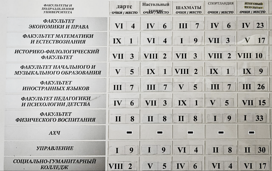 СВОДНАЯ ТАБЛИЦА РЕЗУЛЬТАТОВ КРУГЛОГОДИЧНОЙ СПАРТАКИАДЫ СРЕДИ ФАКУЛЬТЕТОВ